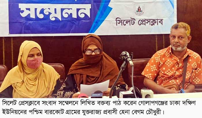 সোমবার (২৭ এপ্রিল) সিলেট প্রেসক্লাবে আয়োজিত এক সংবাদ সম্মেলনে এসব অভিযোগ করেন গোলাপগঞ্জ উপজেলার ঢাকা দক্ষিণ ইউনিয়নের পশ্চিম বারকোট গ্রামের মরহুম মাসুক উদ্দিন চৌধুরীর স্ত্রী ও যুক্তরাজ্য প্রবাসী হেনা বেগম চৌধুরী। সংবাদ সম্মেলনে লিখিত বক্তব্যে হেনা বেগম চৌধুরী বলেন, তিনি একজন যুক্তরাজ্য প্রবাসী এবং তার পরিবারের অধিকাংশ সদস্য দীর্ঘদিন ধরে বিদেশে বসবাস করছেন। দেশের প্রতি ভালোবাসা থেকে তারা দেশে এসে বিনিয়োগ করেন এবং সমাজ ও দেশের উন্নয়নে অবদান রাখার চেষ্টা করেন।