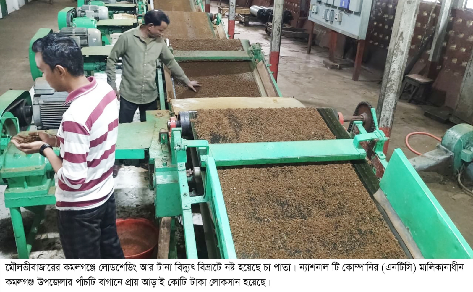 লোডশেডিং আর টানা বিদ্যুৎ বিভ্রাটে নষ্ট হয়েছে প্রায় ৬০ হাজার কেজি চা পাতা, যার বাজারমূল্য প্রায় আড়াই কোটি টাকা। ন্যাশনাল টি কোম্পানি (এনটিসি) সুত্রে জানা যায়, গত ২৫ থেকে ২৯ এপ্রিল পর্যন্ত কালবৈশাখী ঝড়ের তান্ডবে বিদ্যুৎহীন হয়ে পড়ে গোটা কমলগঞ্জ উপজেলা।